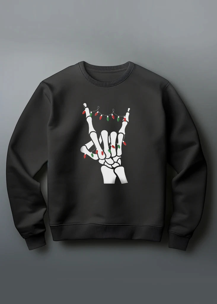 Picture this: cozy nights by the fire, your favorite vinyl spinning, and you wrapped in this ultra-soft knit that speaks to your soul. The skeleton throwing up metal horns is equal parts playful and punk, a nod to those who dance to their own rhythm, even during the most wonderful time of the year.